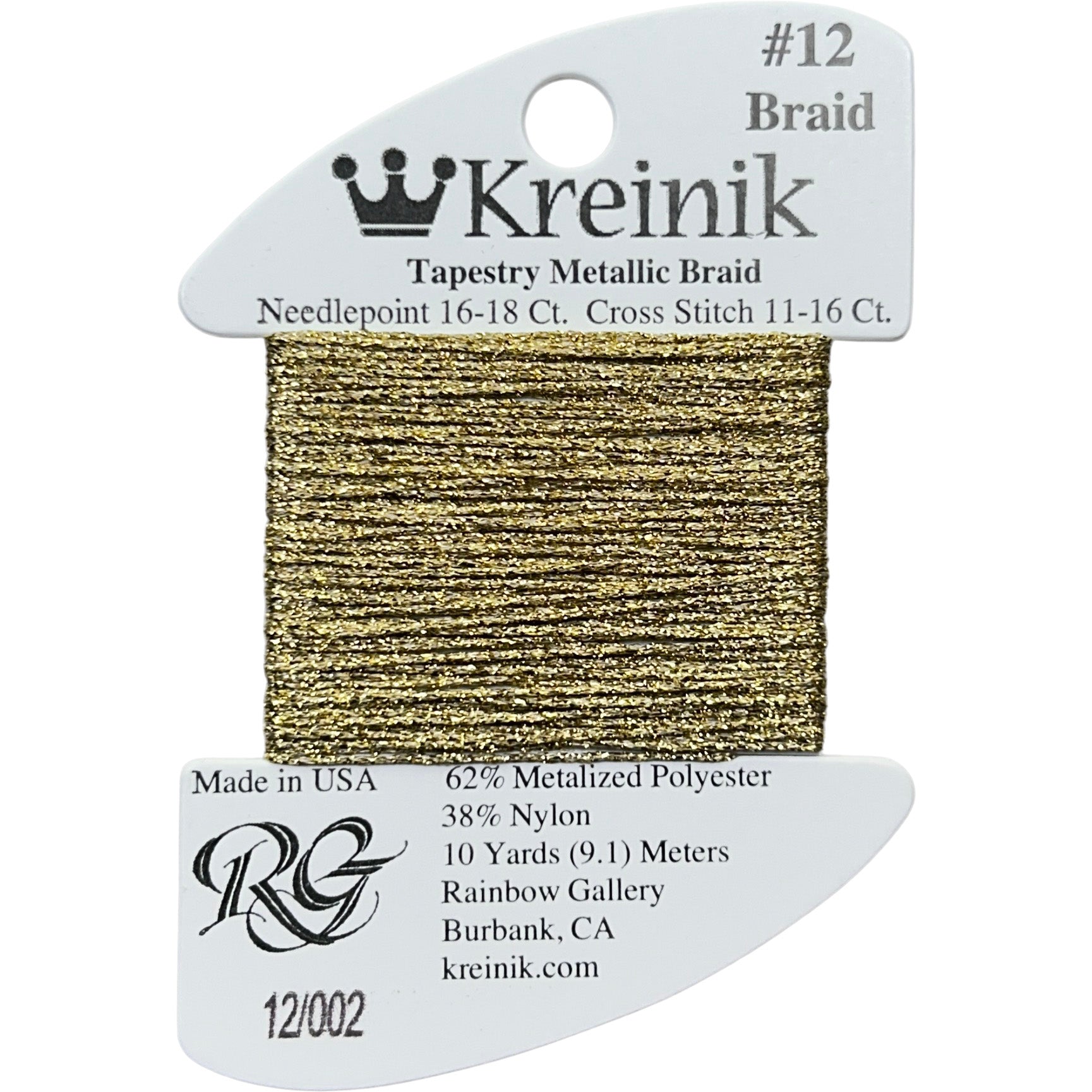 This is Kreinik Braid #12 from Rainbow Gallery in color 0002 Gold. Metallic sparkle. 1 ply on 18 mesh. About equivalent in size to #5 Perle Cotton.