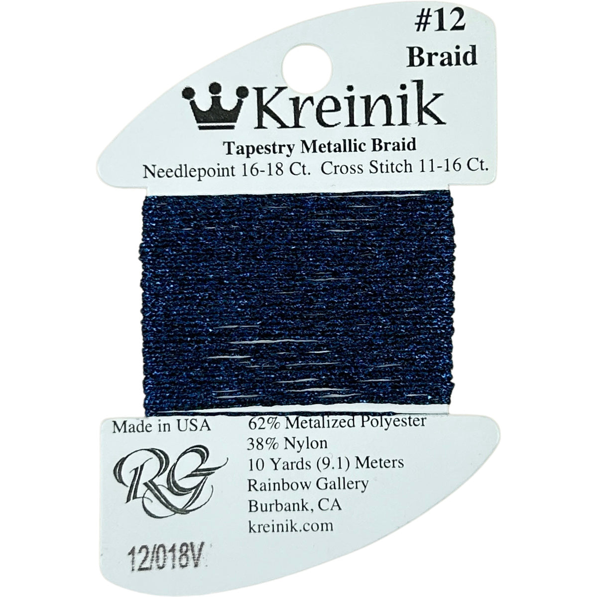 This is Kreinik Braid #12 from Rainbow Gallery in color 0018V Vintage Navy. Metallic sparkle. 1 ply on 18 mesh. About equivalent in size to #5 Perle Cotton.