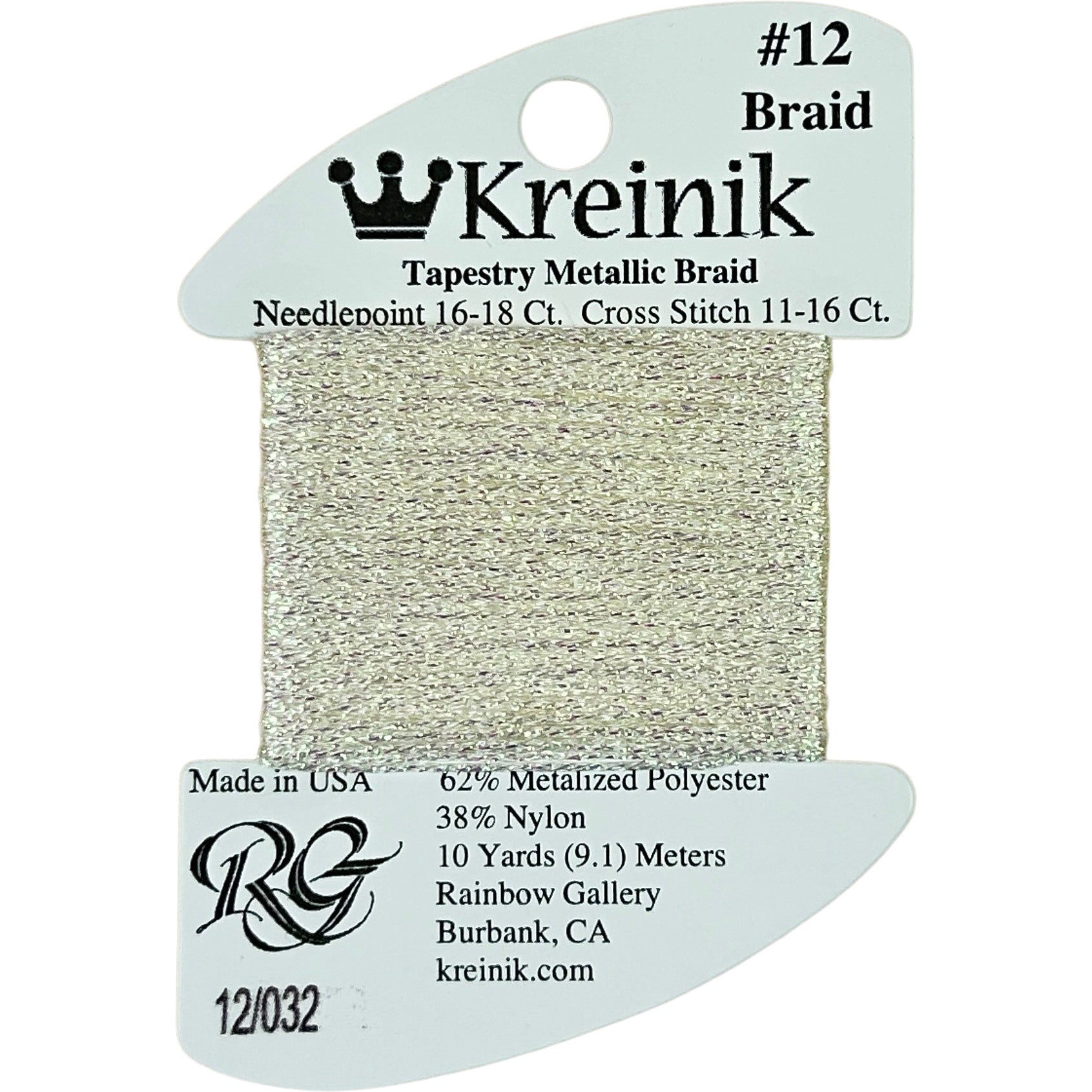 This is Kreinik Braid #12 from Rainbow Gallery in color 0032 Pearl. Metallic sparkle. 1 ply on 18 mesh. About equivalent in size to #5 Perle Cotton.