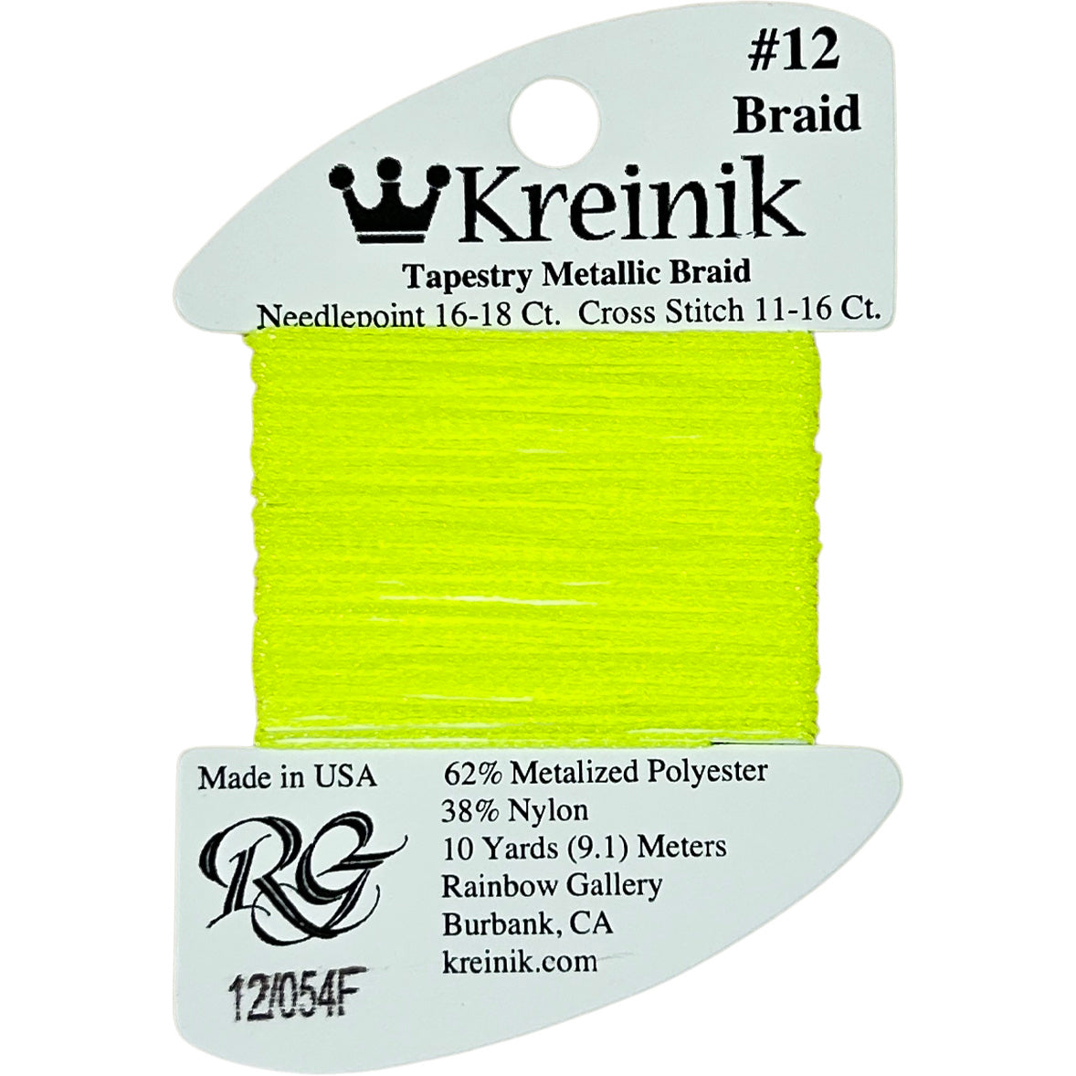 This is Kreinik Braid #12 from Rainbow Gallery in color 0054F Lemon-Lime. Metallic sparkle. 1 ply on 18 mesh. About equivalent in size to #5 Perle Cotton.
