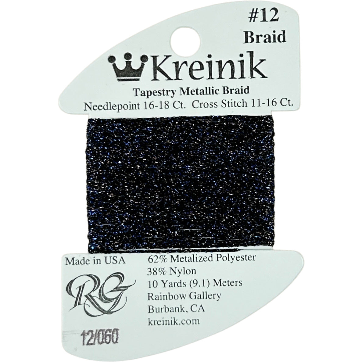 This is Kreinik Braid #12 from Rainbow Gallery in color 0060 Midnight. Metallic sparkle. 1 ply on 18 mesh. About equivalent in size to #5 Perle Cotton.