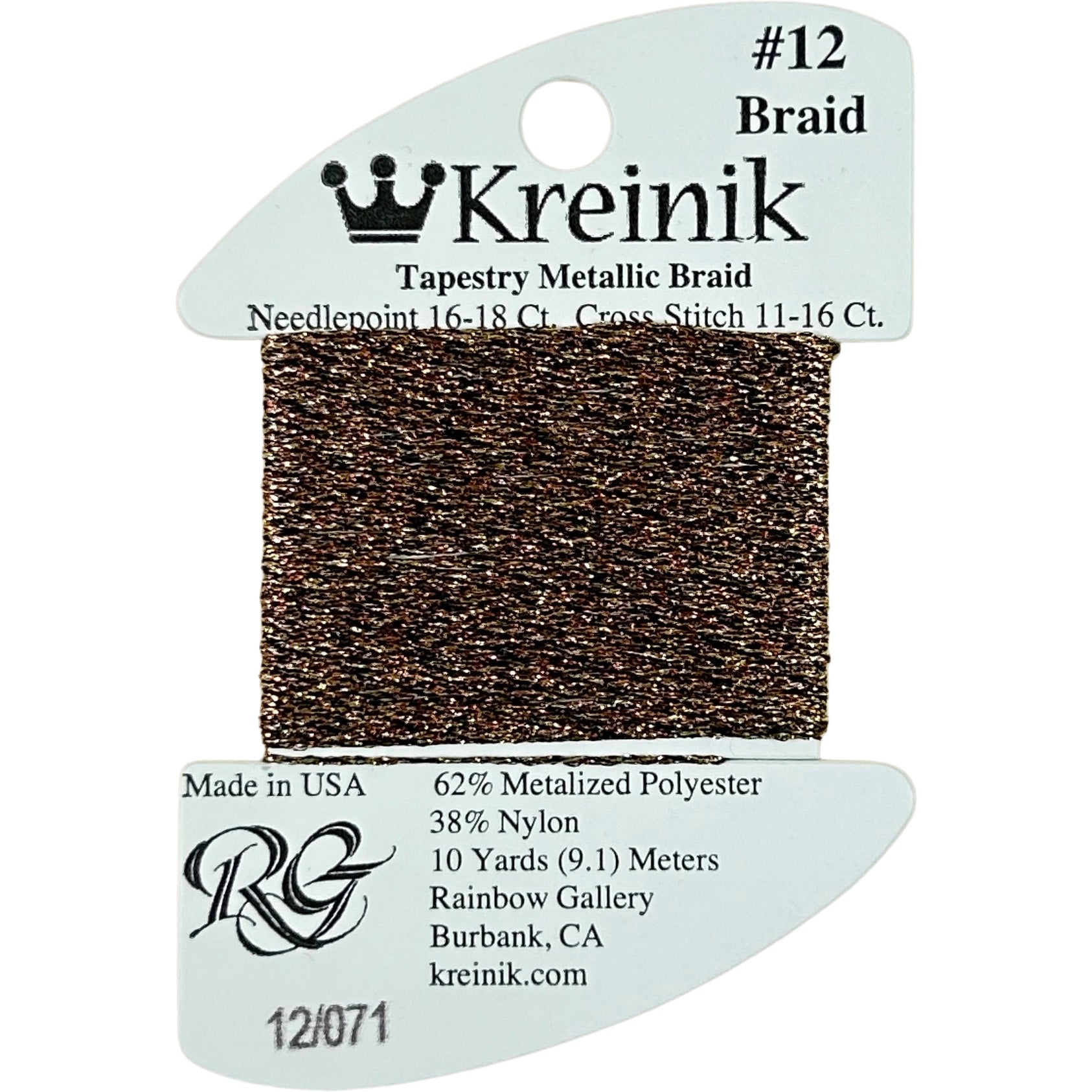 This is Kreinik Braid #12 from Rainbow Gallery in color 0071 Misty Gold. Metallic sparkle. 1 ply on 18 mesh. About equivalent in size to #5 Perle Cotton.