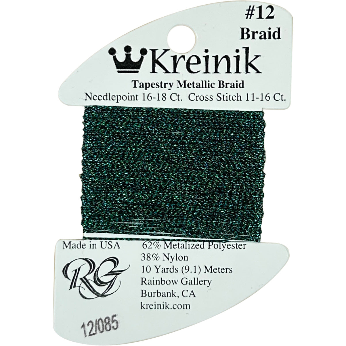 This is Kreinik Braid #12 from Rainbow Gallery in color 0085 Peacock. Metallic sparkle. 1 ply on 18 mesh. About equivalent in size to #5 Perle Cotton.
