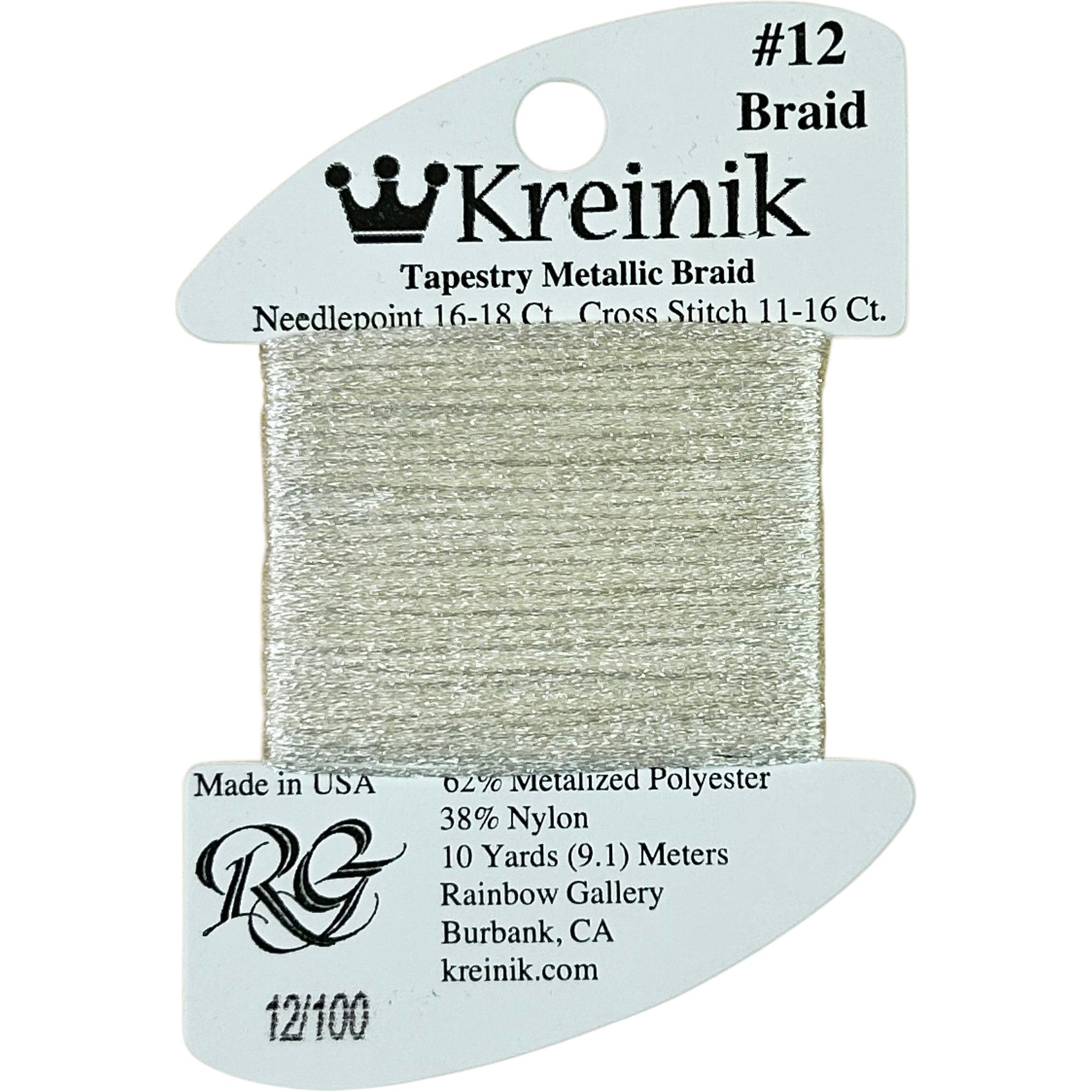 This is Kreinik Braid #12 from Rainbow Gallery in color 0100 White. Metallic sparkle. 1 ply on 18 mesh. About equivalent in size to #5 Perle Cotton.