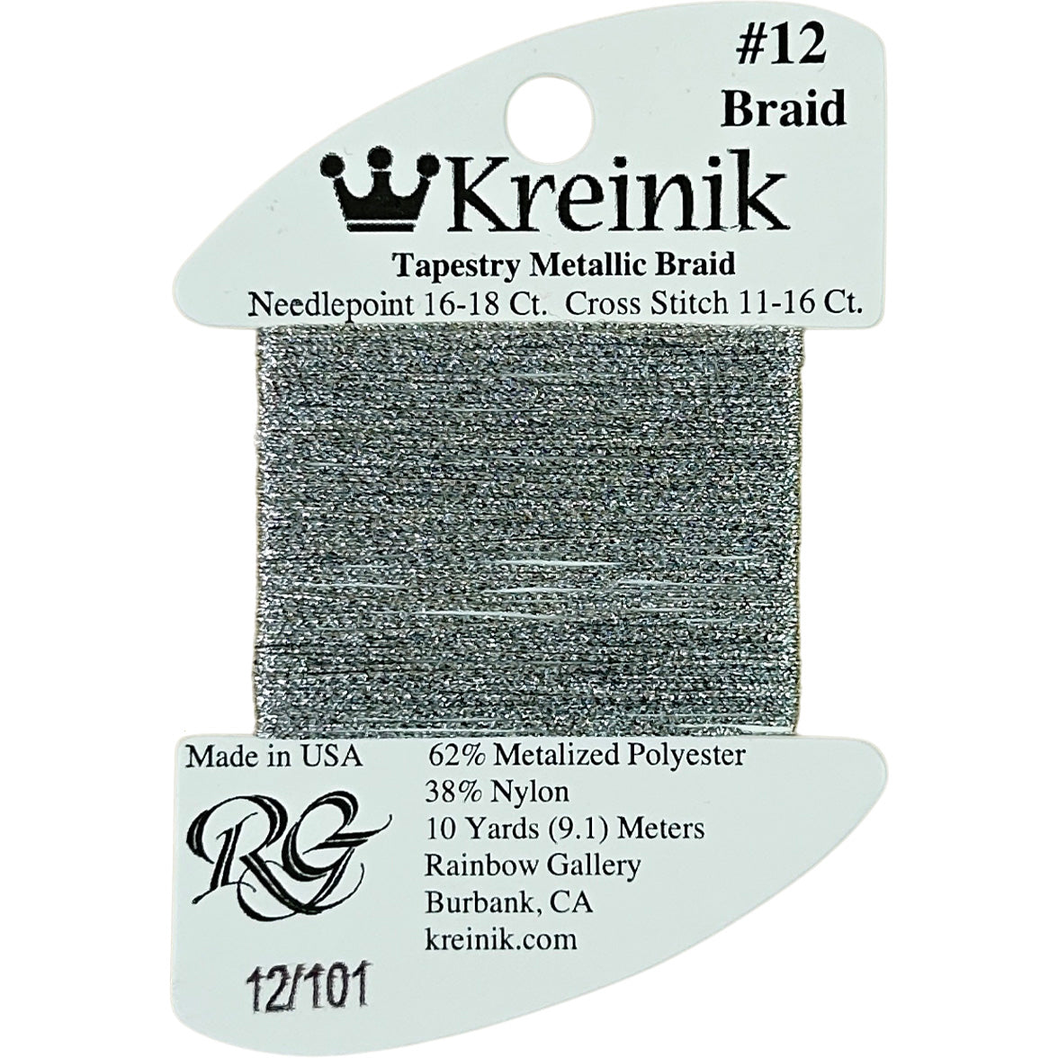 This is Kreinik Braid #12 from Rainbow Gallery in color 0101 Platinum. Metallic sparkle. 1 ply on 18 mesh. About equivalent in size to #5 Perle Cotton.