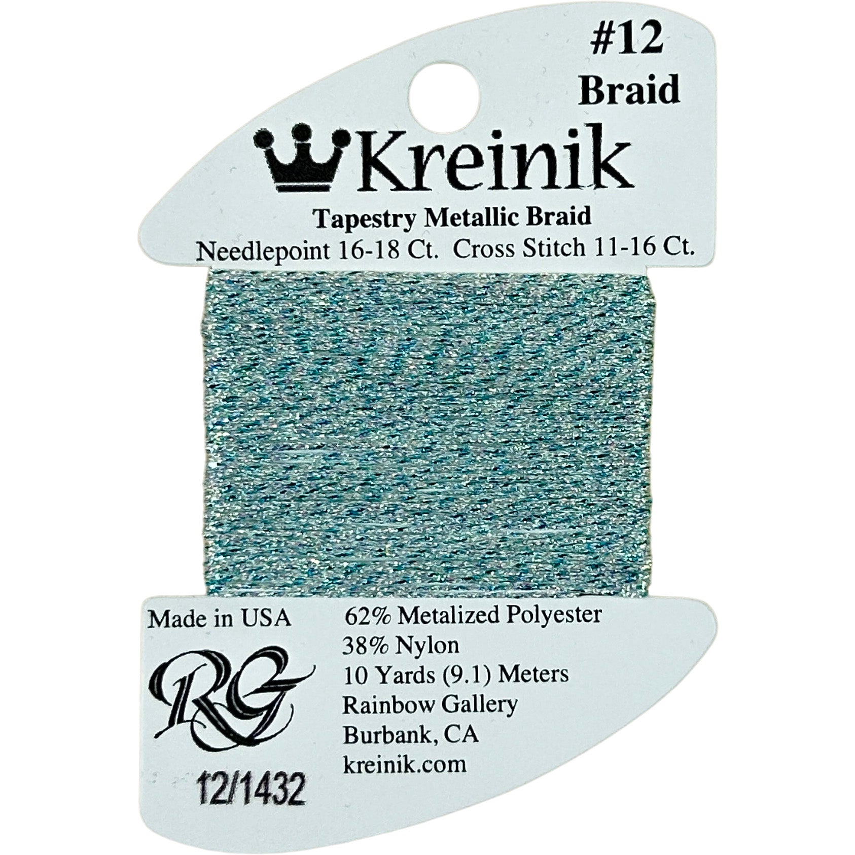 This is Kreinik Braid #12 from Rainbow Gallery in color 1432 Blue Ice. Metallic sparkle. 1 ply on 18 mesh. About equivalent in size to #5 Perle Cotton.