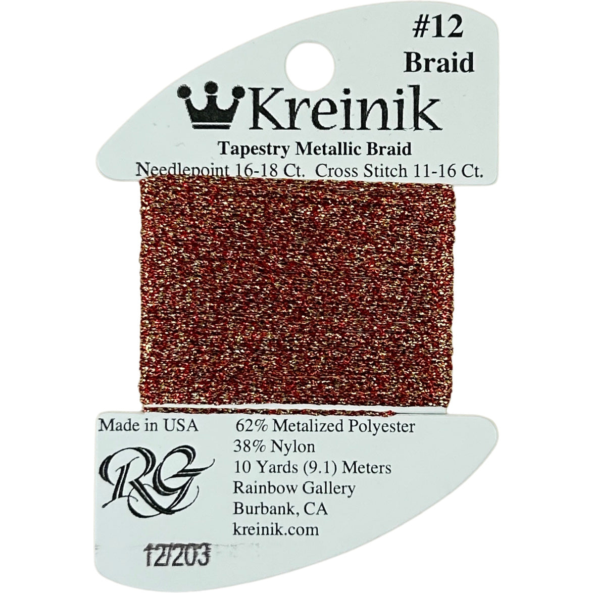 This is Kreinik Braid #12 from Rainbow Gallery in color 0203 Flame. Metallic sparkle. 1 ply on 18 mesh. About equivalent in size to #5 Perle Cotton.