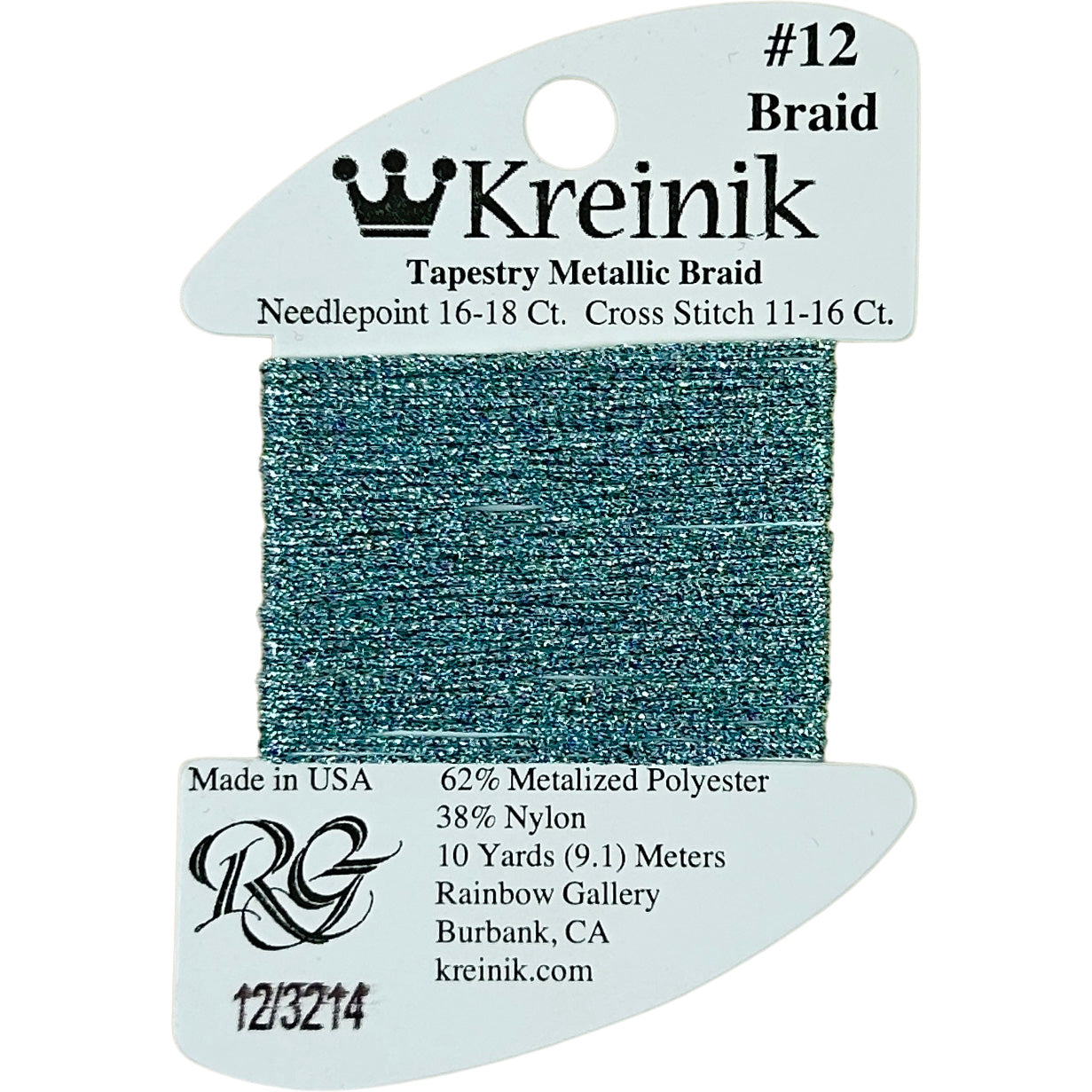 This is Kreinik Braid #12 from Rainbow Gallery in color 3214 Blue Zircon. Metallic sparkle. 1 ply on 18 mesh. About equivalent in size to #5 Perle Cotton.