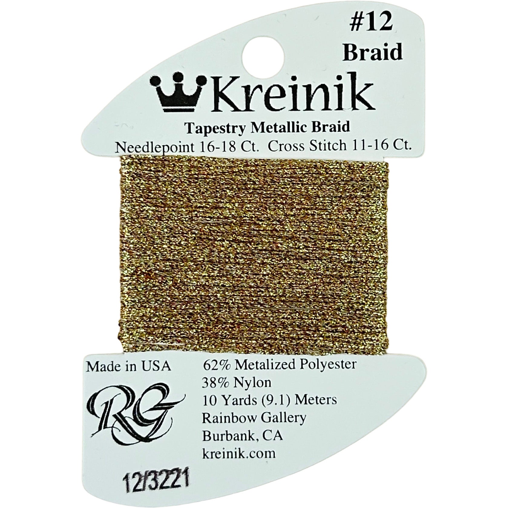 This is Kreinik Braid #12 from Rainbow Gallery in color 3221 Heliodor. Metallic sparkle. 1 ply on 18 mesh. About equivalent in size to #5 Perle Cotton.
