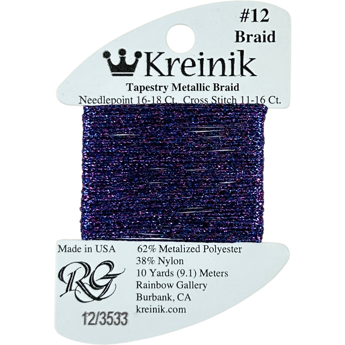 This is Kreinik Braid #12 from Rainbow Gallery in color 3533 Purple Mambo. Metallic sparkle. 1 ply on 18 mesh. About equivalent in size to #5 Perle Cotton.