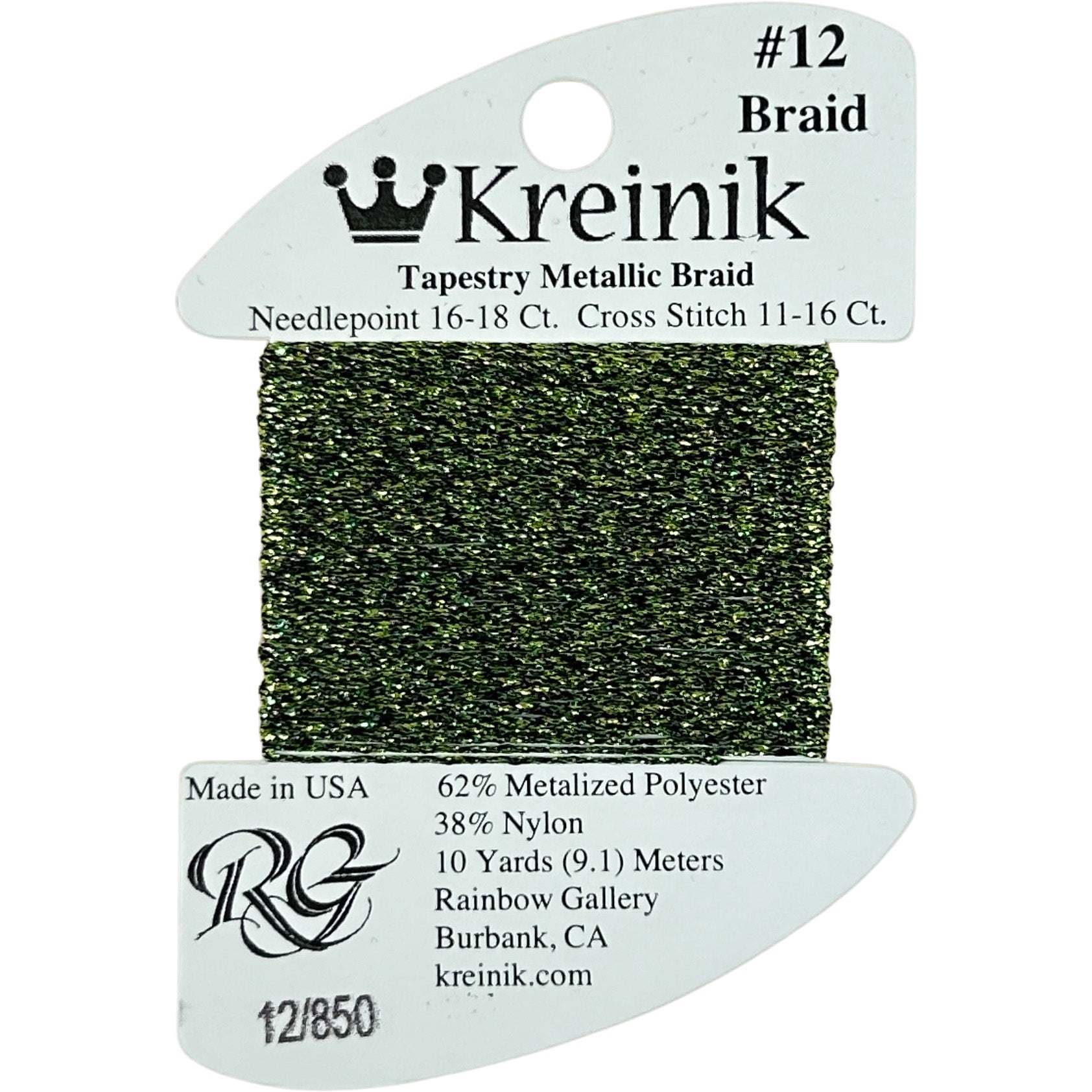 This is Kreinik Braid #12 from Rainbow Gallery in color 0850 Mallard. Metallic sparkle. 1 ply on 18 mesh. About equivalent in size to #5 Perle Cotton.