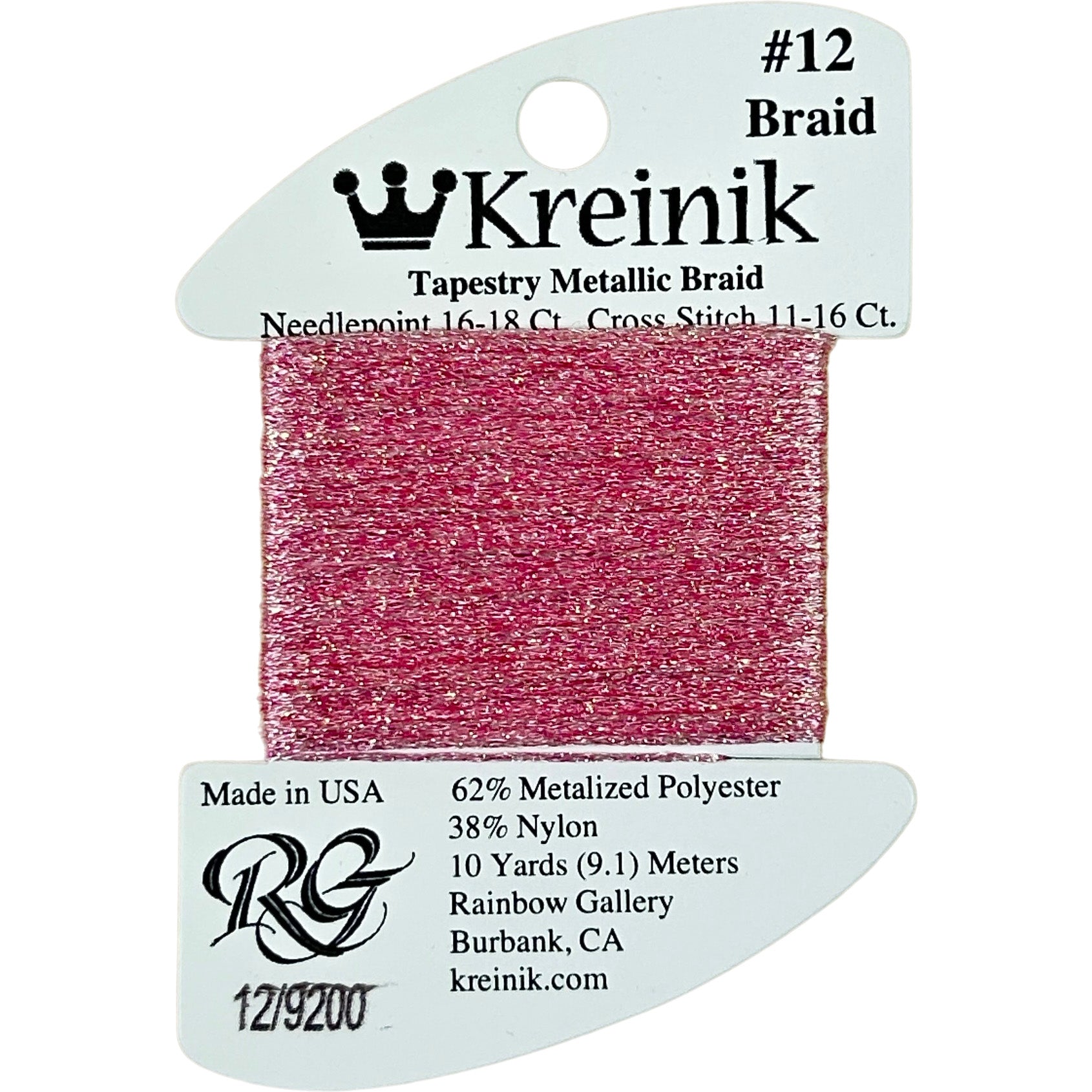 This is Kreinik Braid #12 from Rainbow Gallery in color 9200 Blossom. Metallic sparkle. 1 ply on 18 mesh. About equivalent in size to #5 Perle Cotton.