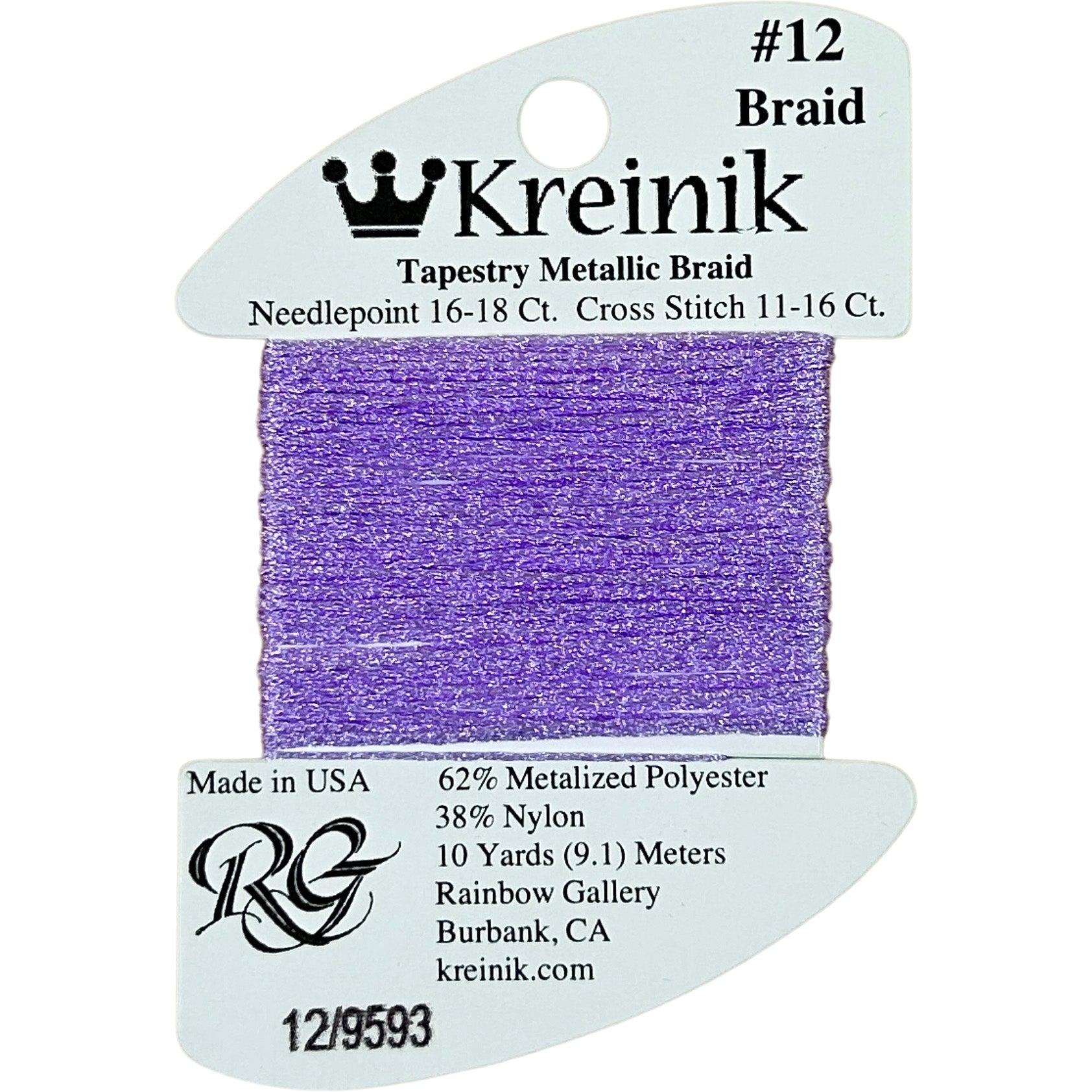 This is Kreinik Braid #12 from Rainbow Gallery in color 9593 Wisteria. Metallic sparkle. 1 ply on 18 mesh. About equivalent in size to #5 Perle Cotton.