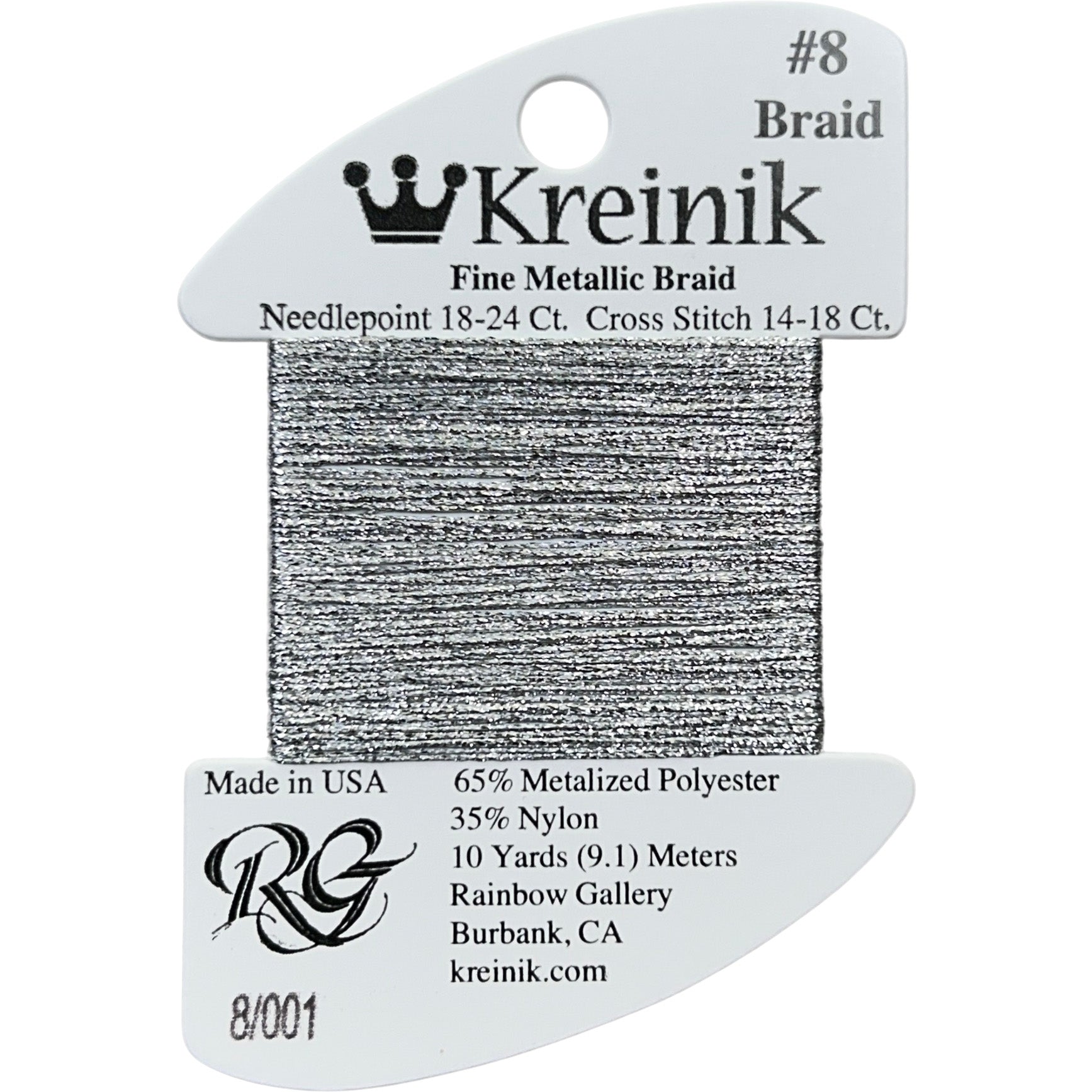 This is Kreinik Fine Braid #8 from Rainbow Gallery in color 0001 Silver. Metallic sparkle.1 ply on 18 mesh for light coverage. About equivalent in size to #8 Perle Cotton.