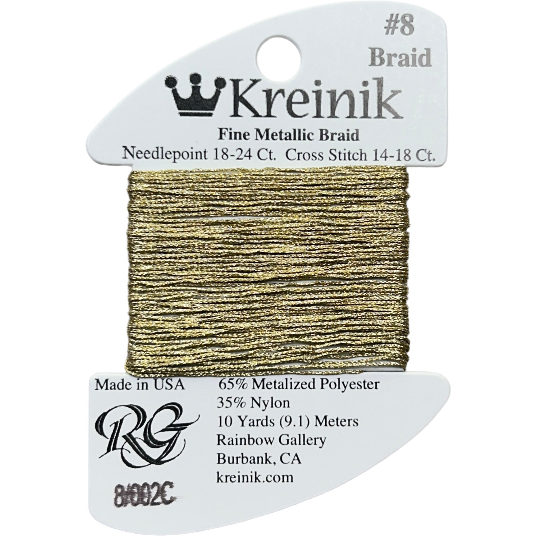 This is Kreinik Fine Braid #8 from Rainbow Gallery in color 0002C Gold Cord. Metallic sparkle.1 ply on 18 mesh for light coverage. About equivalent in size to #8 Perle Cotton.