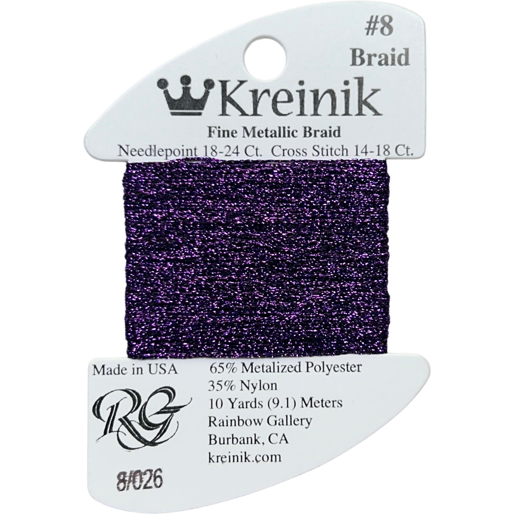 This is Kreinik Fine Braid #8 from Rainbow Gallery in color 0026 Amethyst. Metallic sparkle.1 ply on 18 mesh for light coverage. About equivalent in size to #8 Perle Cotton.