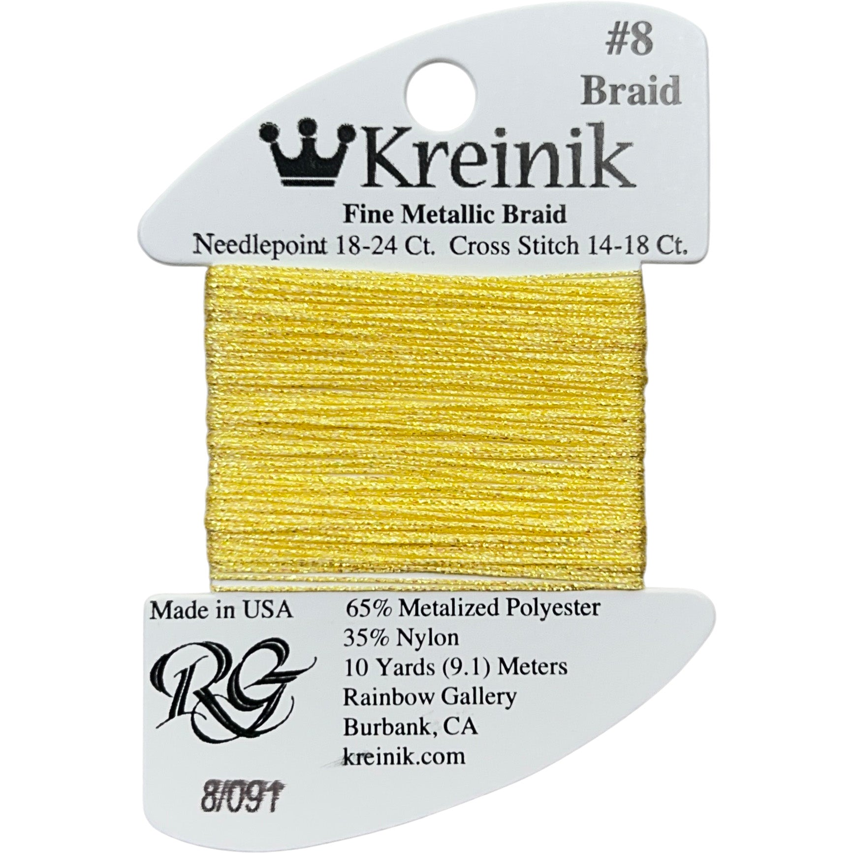 This is Kreinik Fine Braid #8 from Rainbow Gallery in color 0091 Star Yellow. Metallic sparkle.1 ply on 18 mesh for light coverage. About equivalent in size to #8 Perle Cotton.