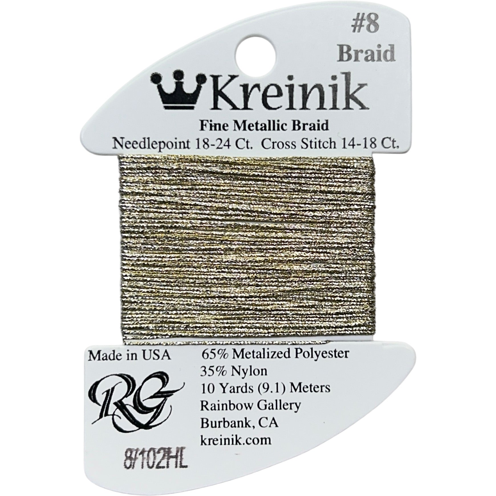 This is Kreinik Fine Braid #8 from Rainbow Gallery in color 0102HL Vatican Gold High Lustre. Metallic sparkle.1 ply on 18 mesh for light coverage. About equivalent in size to #8 Perle Cotton.