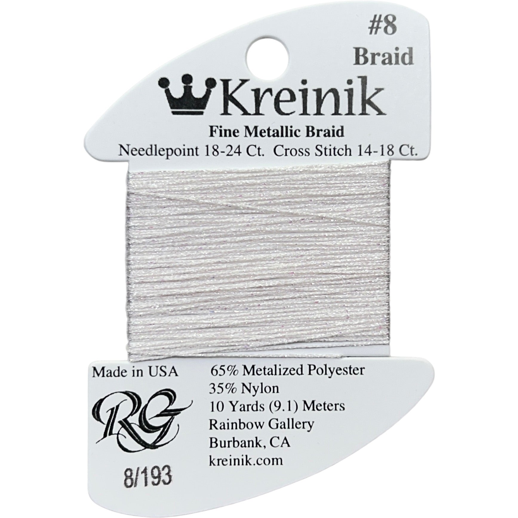This is Kreinik Fine Braid #8 from Rainbow Gallery in color 0193 Pale Mauve. Metallic sparkle.1 ply on 18 mesh for light coverage. About equivalent in size to #8 Perle Cotton.