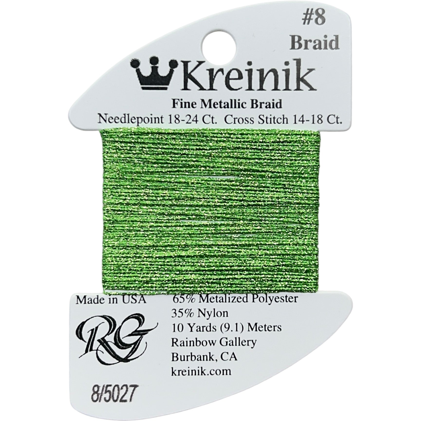 This is Kreinik Fine Braid #8 from Rainbow Gallery in color 5027 Electric Apple. Metallic sparkle.1 ply on 18 mesh for light coverage. About equivalent in size to #8 Perle Cotton.