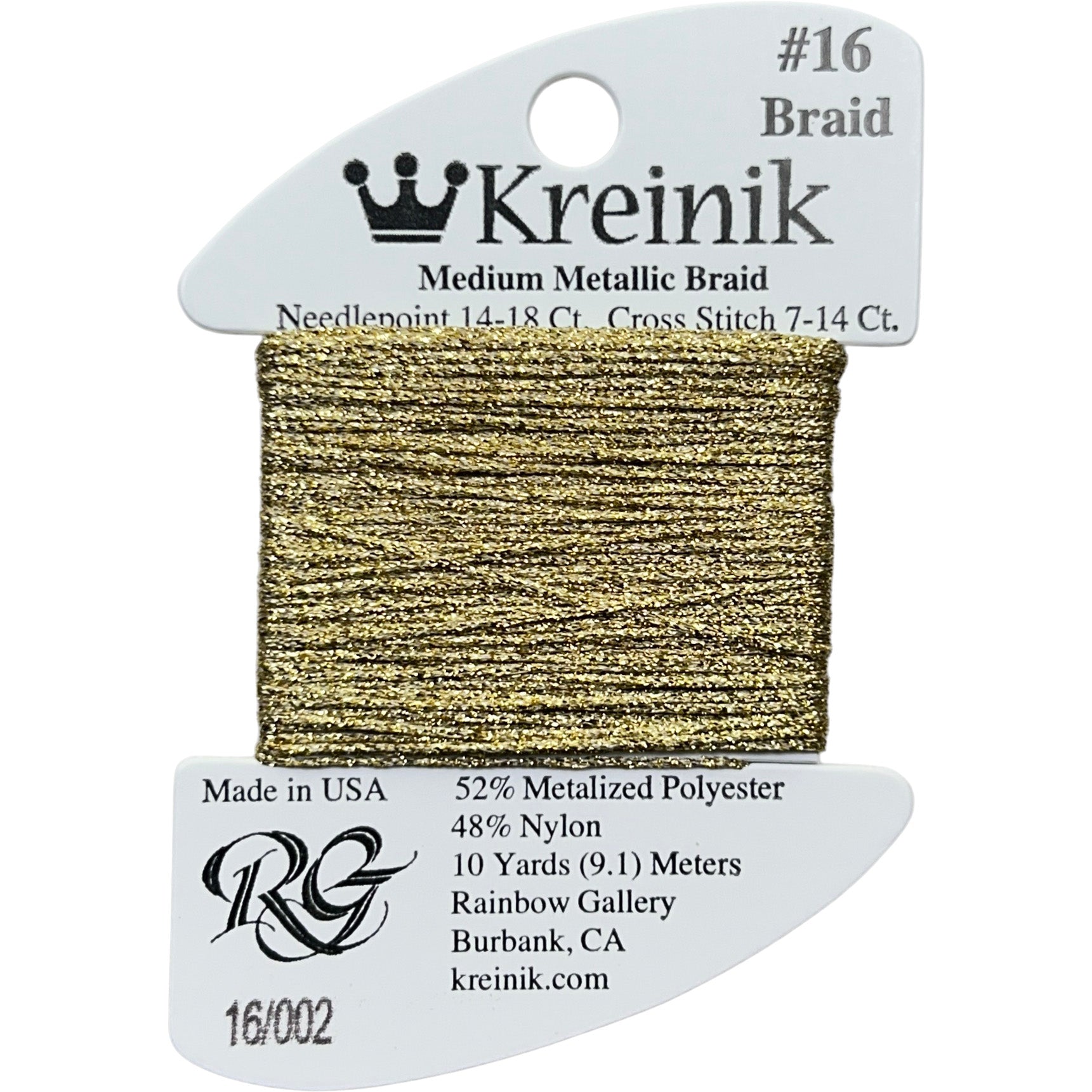 Round metallic mid-size braided thread. Use Medium (#16) Braid in Cross Stitch on 10- & 11-count fabrics, or in Needlepoint on 14- to 18-mesh canvas. You can also couch this thicker metallic in embroidery designs.