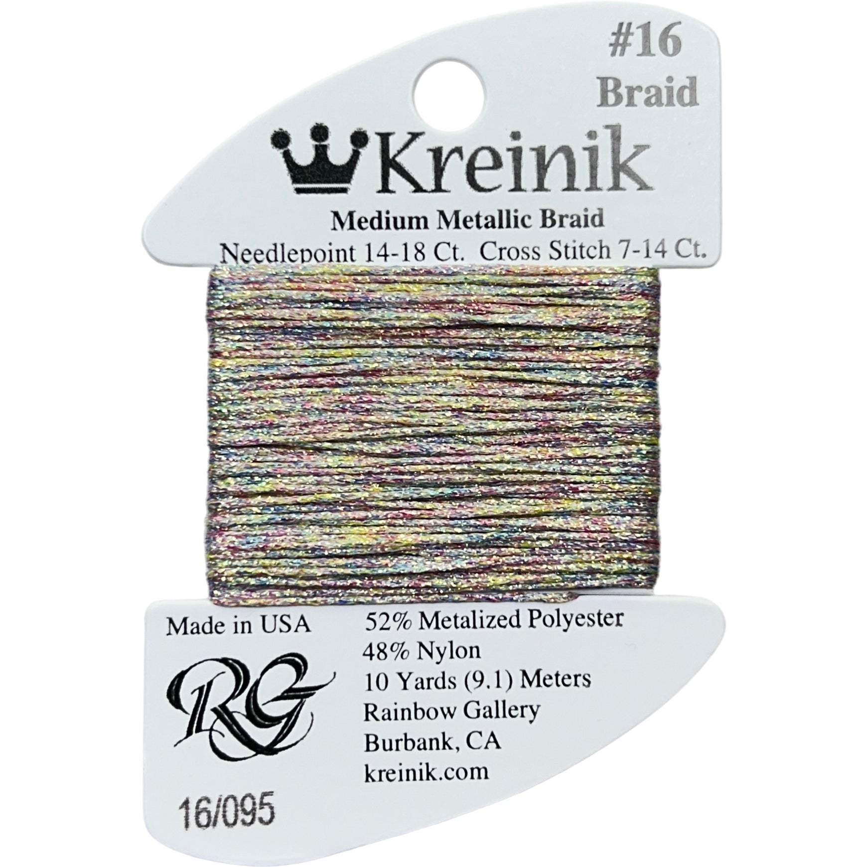 Round metallic mid-size braided thread. Use Medium (#16) Braid in Cross Stitch on 10- & 11-count fabrics, or in Needlepoint on 14- to 18-mesh canvas. You can also couch this thicker metallic in embroidery designs.