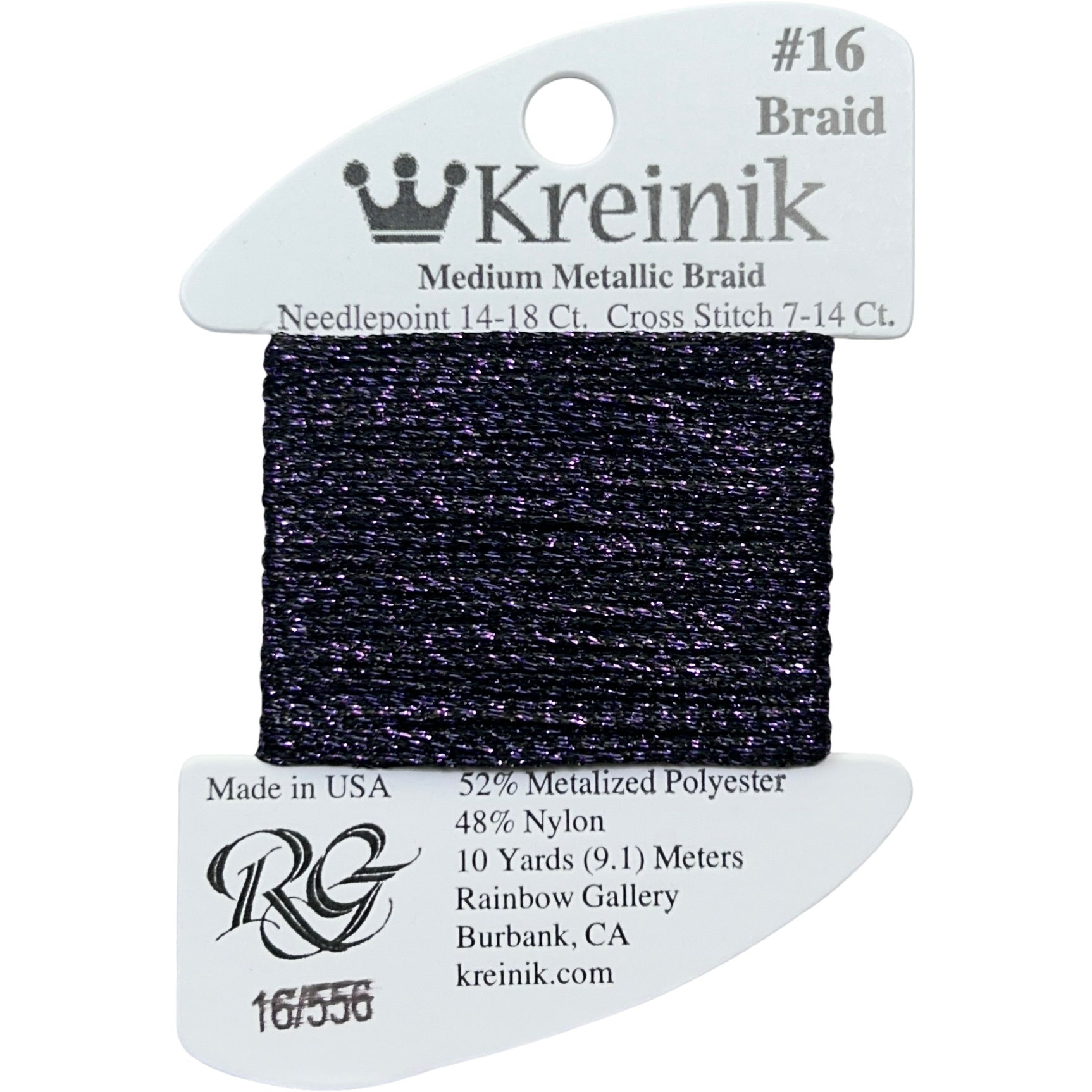 Round metallic mid-size braided thread. Use Medium (#16) Braid in Cross Stitch on 10- & 11-count fabrics, or in Needlepoint on 14- to 18-mesh canvas. You can also couch this thicker metallic in embroidery designs.