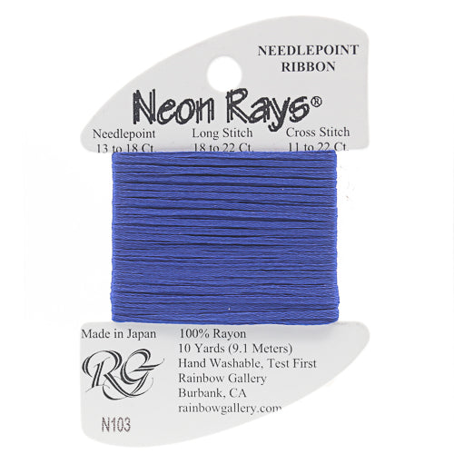 This is Neon Rays from Rainbow Gallery in color 103 Indigo Blue. A shiny rayon ribbon that is excellent for creating metallic and porcelain textures. Works to great effect with long stitches. Use as-is on all sizes.