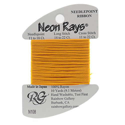 This is Neon Rays from Rainbow Gallery in color 108 Yellow Orange. A shiny rayon ribbon that is excellent for creating metallic and porcelain textures. Works to great effect with long stitches. Use as-is on all sizes.