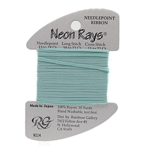 This is Neon Rays from Rainbow Gallery in color 114 Light Seafoam Green. A shiny rayon ribbon that is excellent for creating metallic and porcelain textures. Works to great effect with long stitches. Use as-is on all sizes.