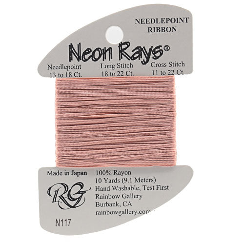 This is Neon Rays from Rainbow Gallery in color 117 Medium Peach. A shiny rayon ribbon that is excellent for creating metallic and porcelain textures. Works to great effect with long stitches. Use as-is on all sizes.