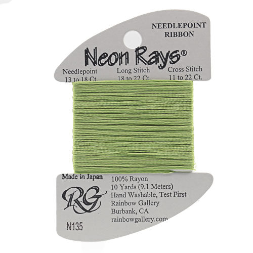This is Neon Rays from Rainbow Gallery in color 135 Chartreuse. A shiny rayon ribbon that is excellent for creating metallic and porcelain textures. Works to great effect with long stitches. Use as-is on all sizes.