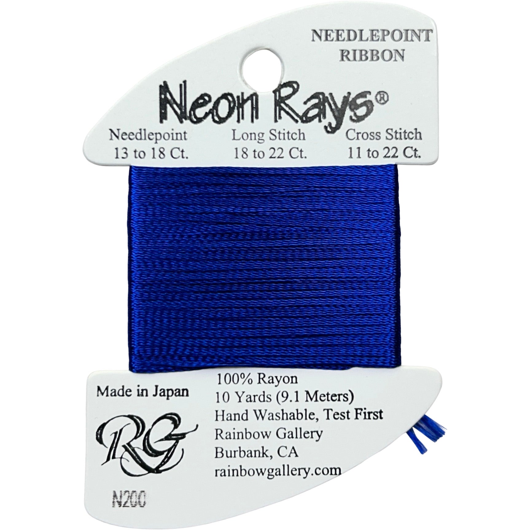 This is Neon Rays from Rainbow Gallery in color 200 Imperial Blue. A shiny rayon ribbon that is excellent for creating metallic and porcelain textures. Works to great effect with long stitches. Use as-is on all sizes.