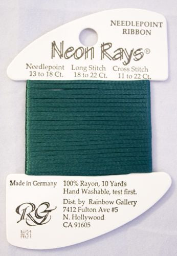 This is Neon Rays from Rainbow Gallery in color 031 Forest Green. A shiny rayon ribbon that is excellent for creating metallic and porcelain textures. Works to great effect with long stitches. Use as-is on all sizes.