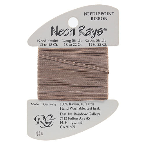 This is Neon Rays from Rainbow Gallery in color 044 Light Smoke Brown. A shiny rayon ribbon that is excellent for creating metallic and porcelain textures. Works to great effect with long stitches. Use as-is on all sizes.