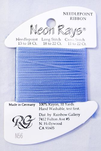 This is Neon Rays from Rainbow Gallery in color 056 Light Blue. A shiny rayon ribbon that is excellent for creating metallic and porcelain textures. Works to great effect with long stitches. Use as-is on all sizes.