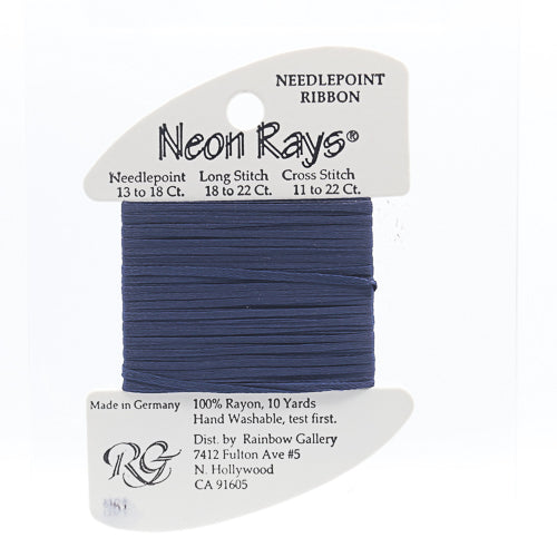 This is Neon Rays from Rainbow Gallery in color 061 Midnight Blue. A shiny rayon ribbon that is excellent for creating metallic and porcelain textures. Works to great effect with long stitches. Use as-is on all sizes.