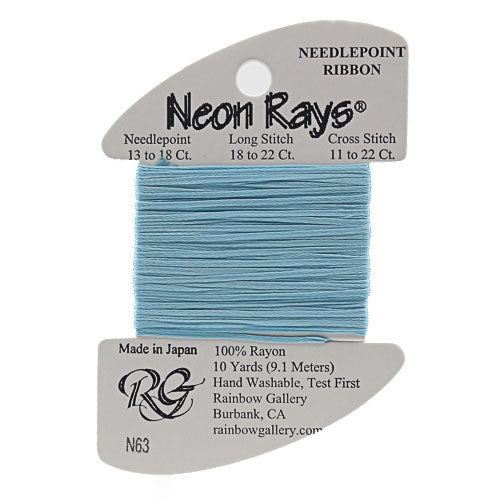 This is Neon Rays from Rainbow Gallery in color 063 Light Aqua. A shiny rayon ribbon that is excellent for creating metallic and porcelain textures. Works to great effect with long stitches. Use as-is on all sizes.