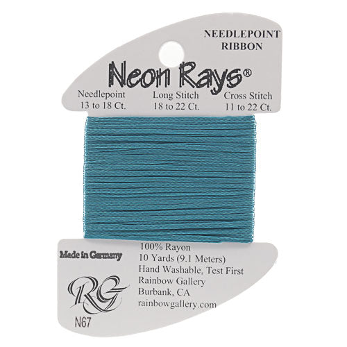 This is Neon Rays from Rainbow Gallery in color 067 Dark Teal. A shiny rayon ribbon that is excellent for creating metallic and porcelain textures. Works to great effect with long stitches. Use as-is on all sizes.