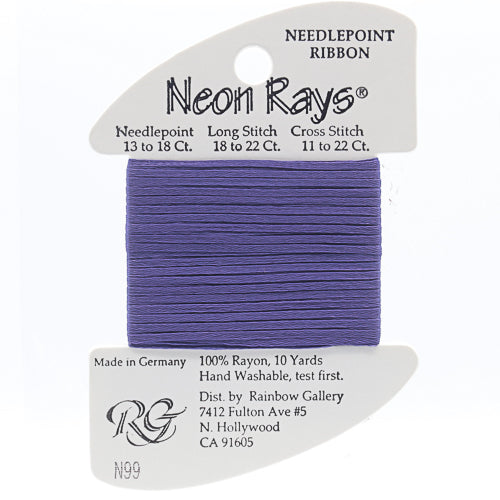 This is Neon Rays from Rainbow Gallery in color 099 Deep Violet. A shiny rayon ribbon that is excellent for creating metallic and porcelain textures. Works to great effect with long stitches. Use as-is on all sizes.