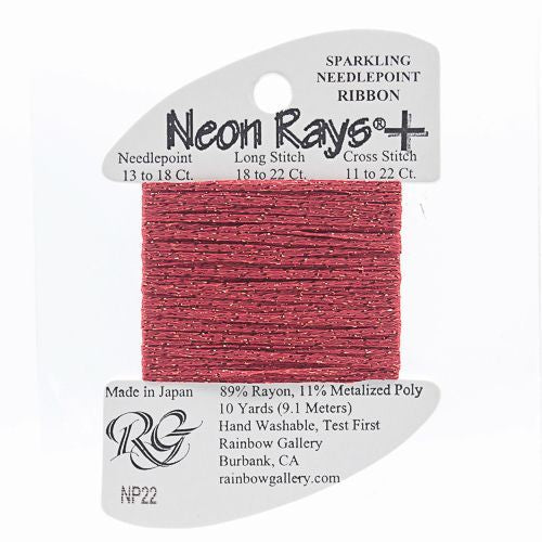 This is Neon Rays Plus from Rainbow Gallery in color 022 Crimson. A shiny rayon ribbon with hints of sparkles that is excellent for creating metallic and porcelain textures. Works to great effect with long stitches. Use as-is on all sizes.