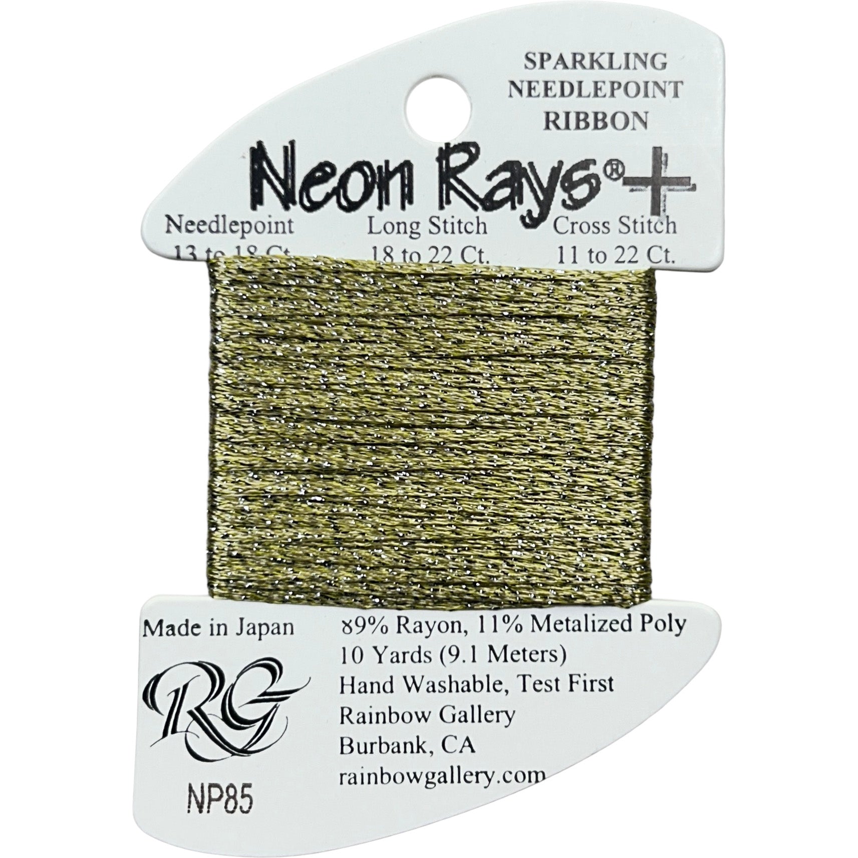 This is Neon Rays Plus from Rainbow Gallery in color 085 Sage Green. A shiny rayon ribbon with hints of sparkles that is excellent for creating metallic and porcelain textures. Works to great effect with long stitches. Use as-is on all sizes.