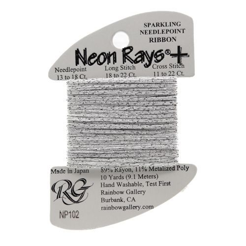 This is Neon Rays Plus from Rainbow Gallery in color 102 Antique White. A shiny rayon ribbon with hints of sparkles that is excellent for creating metallic and porcelain textures. Works to great effect with long stitches. Use as-is on all sizes.