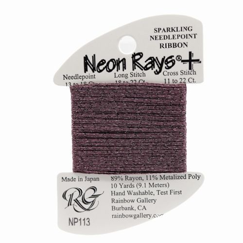 This is Neon Rays Plus from Rainbow Gallery in color 113 Dark Antique Rose. A shiny rayon ribbon with hints of sparkles that is excellent for creating metallic and porcelain textures. Works to great effect with long stitches. Use as-is on all sizes.