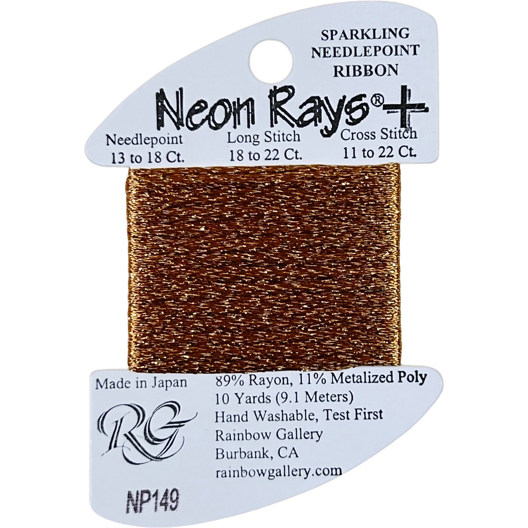 This is Neon Rays Plus from Rainbow Gallery in color 149 Golden Glow. A shiny rayon ribbon with hints of sparkles that is excellent for creating metallic and porcelain textures. Works to great effect with long stitches. Use as-is on all sizes.