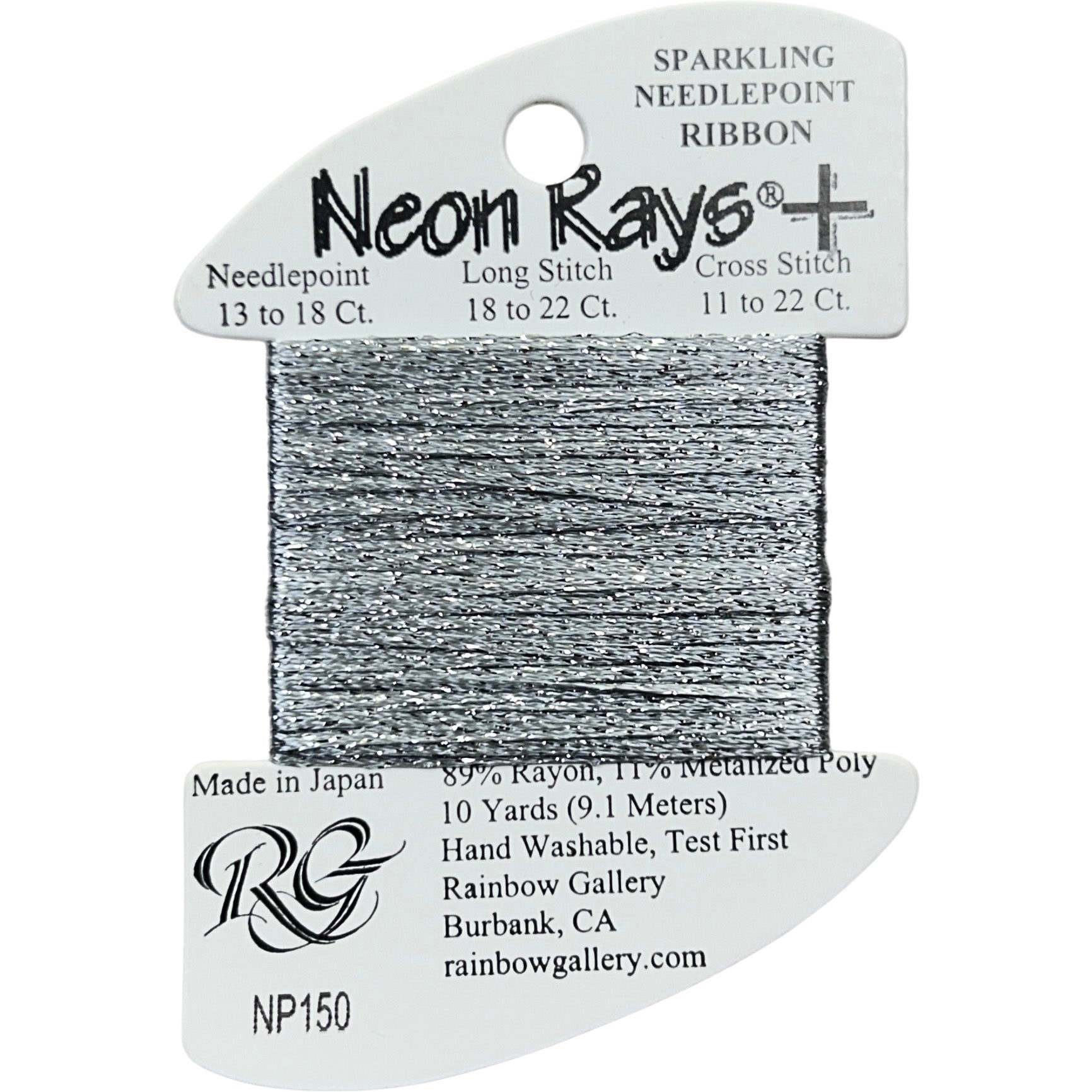 This is Neon Rays Plus from Rainbow Gallery in color 150 Platinum. A shiny rayon ribbon with hints of sparkles that is excellent for creating metallic and porcelain textures. Works to great effect with long stitches. Use as-is on all sizes.
