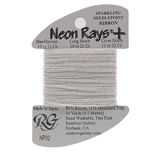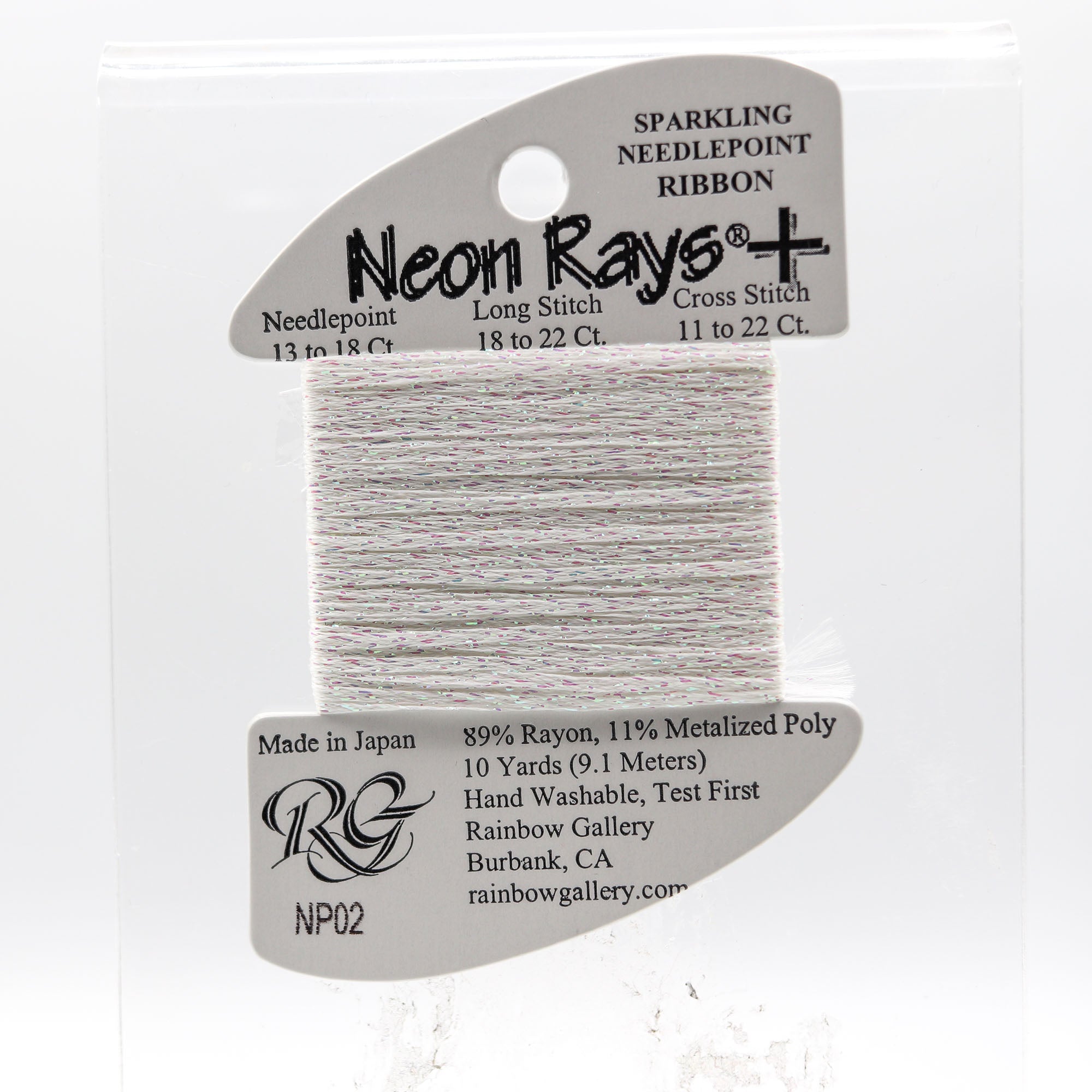 This is Neon Rays Plus from Rainbow Gallery in color 002 White. A shiny rayon ribbon with hints of sparkles that is excellent for creating metallic and porcelain textures. Works to great effect with long stitches. Use as-is on all sizes.