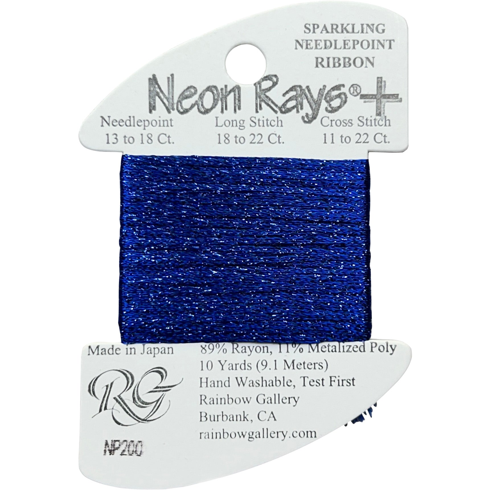 This is Neon Rays Plus from Rainbow Gallery in color 200 Imperial Blue. A shiny rayon ribbon with hints of sparkles that is excellent for creating metallic and porcelain textures. Works to great effect with long stitches. Use as-is on all sizes.