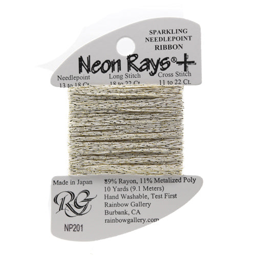 This is Neon Rays Plus from Rainbow Gallery in color 201 Gold Sparkle. A shiny rayon ribbon with hints of sparkles that is excellent for creating metallic and porcelain textures. Works to great effect with long stitches. Use as-is on all sizes.