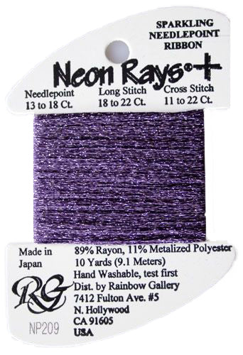 This is Neon Rays Plus from Rainbow Gallery in color 209 Violet. A shiny rayon ribbon with hints of sparkles that is excellent for creating metallic and porcelain textures. Works to great effect with long stitches. Use as-is on all sizes.
